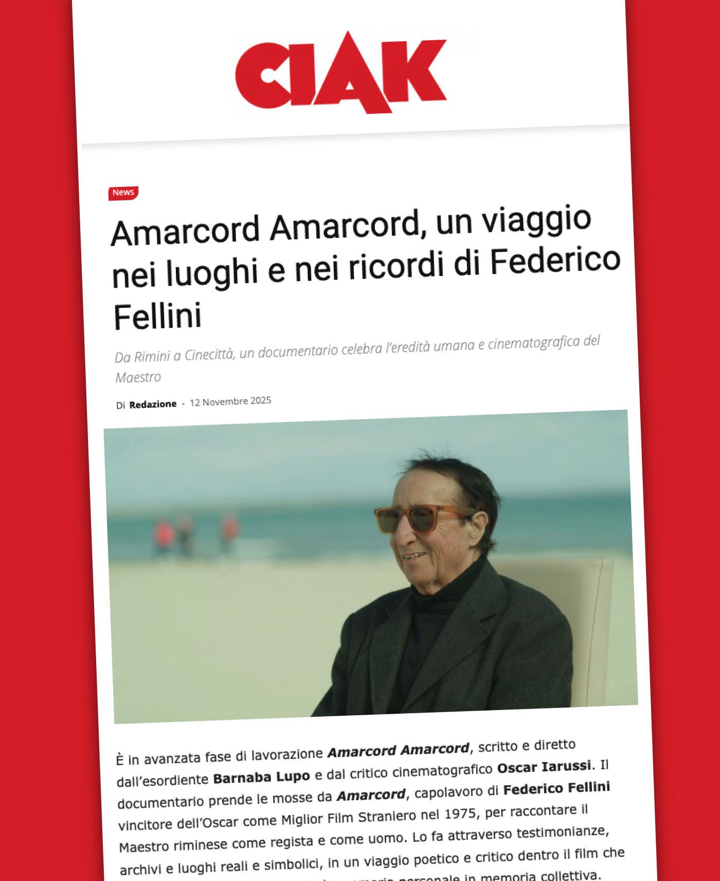“Amarcord Amarcord” su Ciak Magazine Il nostro viaggio nei luoghi e nei ricordi di Fellini Siamo lieti di condividere che Ciak Magazine ha dedicato un articolo al nostro nuovo progetto Amarcord Amarcord, un percorso tra memoria, paesaggi reali e immaginari che rende omaggio all’universo creativo di Federico Fellini. Il pezzo esplora l’idea alla base del documentario e il lavoro di ricerca che stiamo portando avanti per raccontare, con uno sguardo contemporaneo, i luoghi e le suggestioni che hanno nutrito la […]